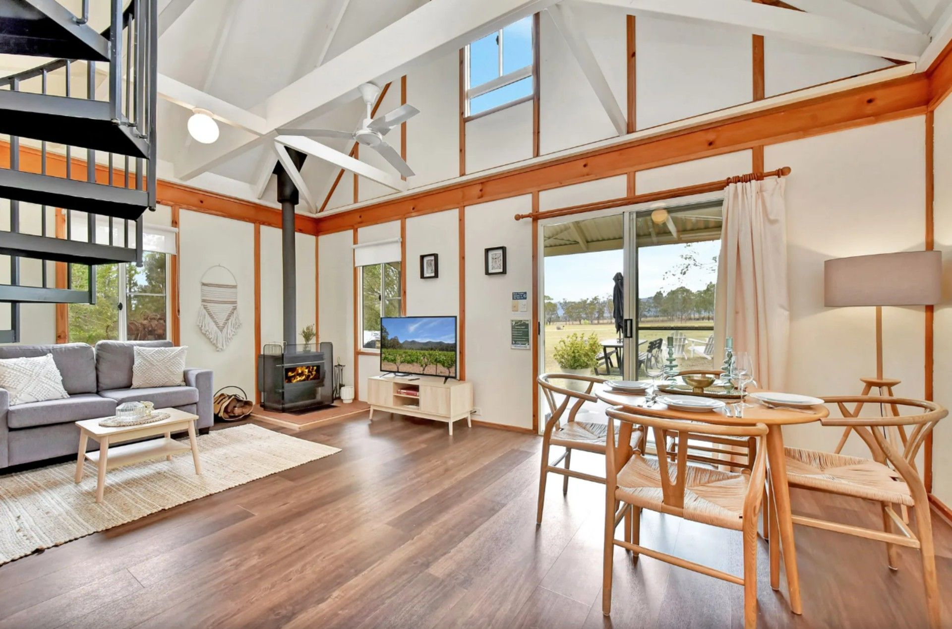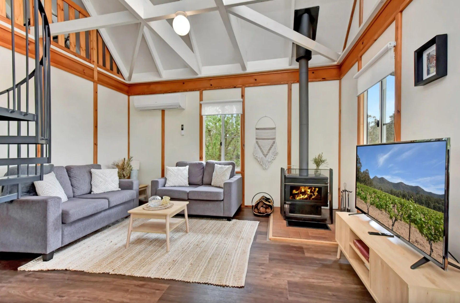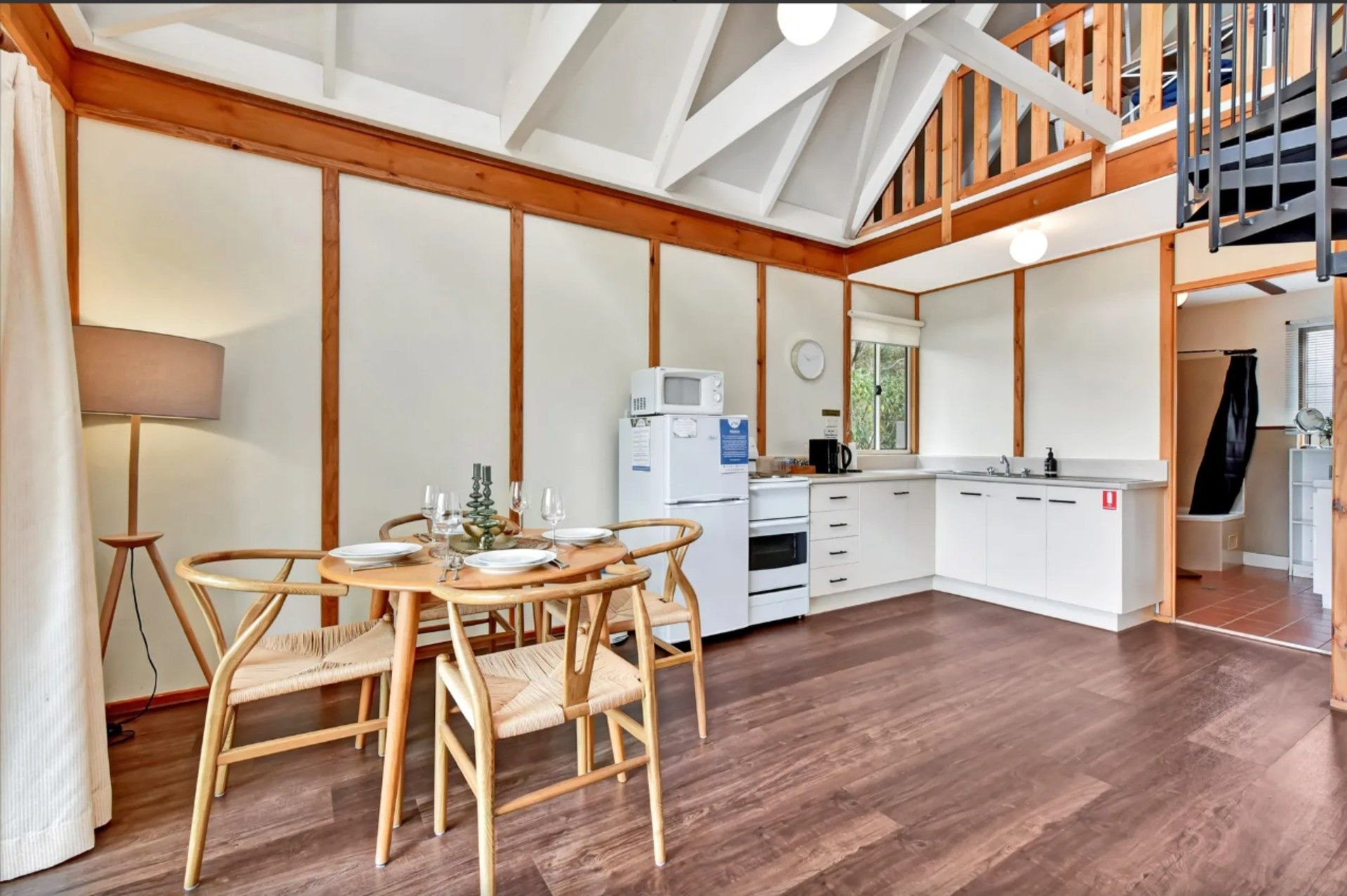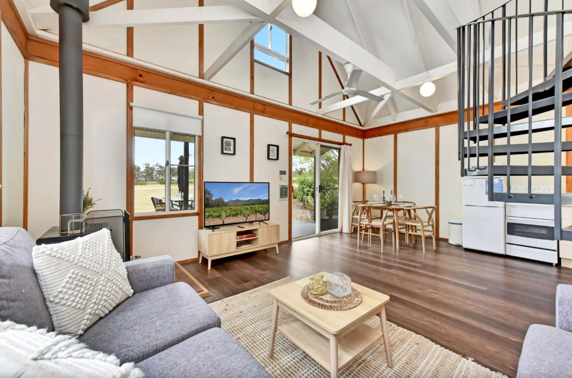 Cathedral ceilings lead to the loft bedroom at the top of the spiral staircase for your romantic holiday. The downstairs bedroom fitted with clean crisp linen on a Queen bed allows easy access. A jet spa tub for two. Enjoy a stroll in the vines or watch kangaroos nibbling grass at dusk.