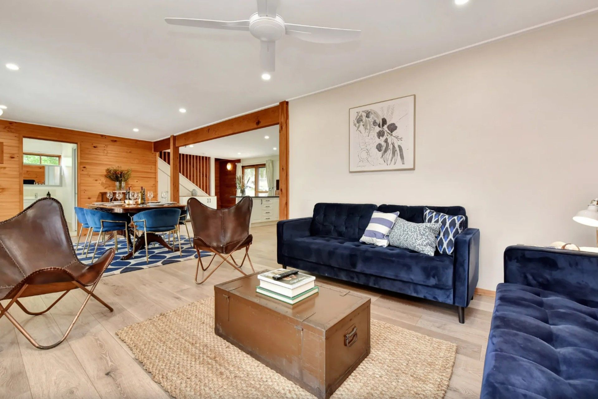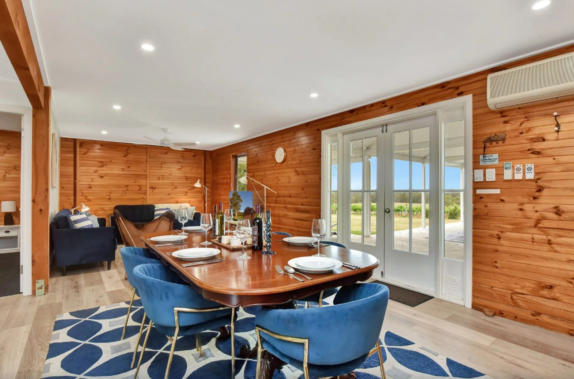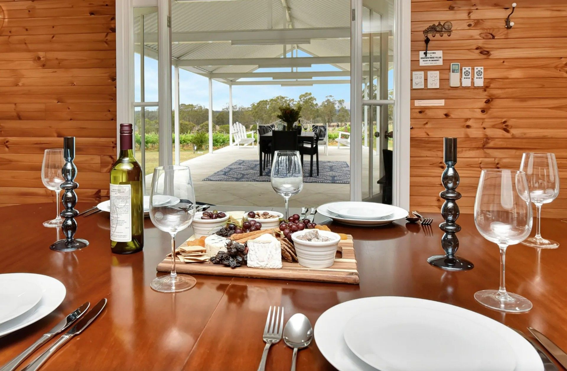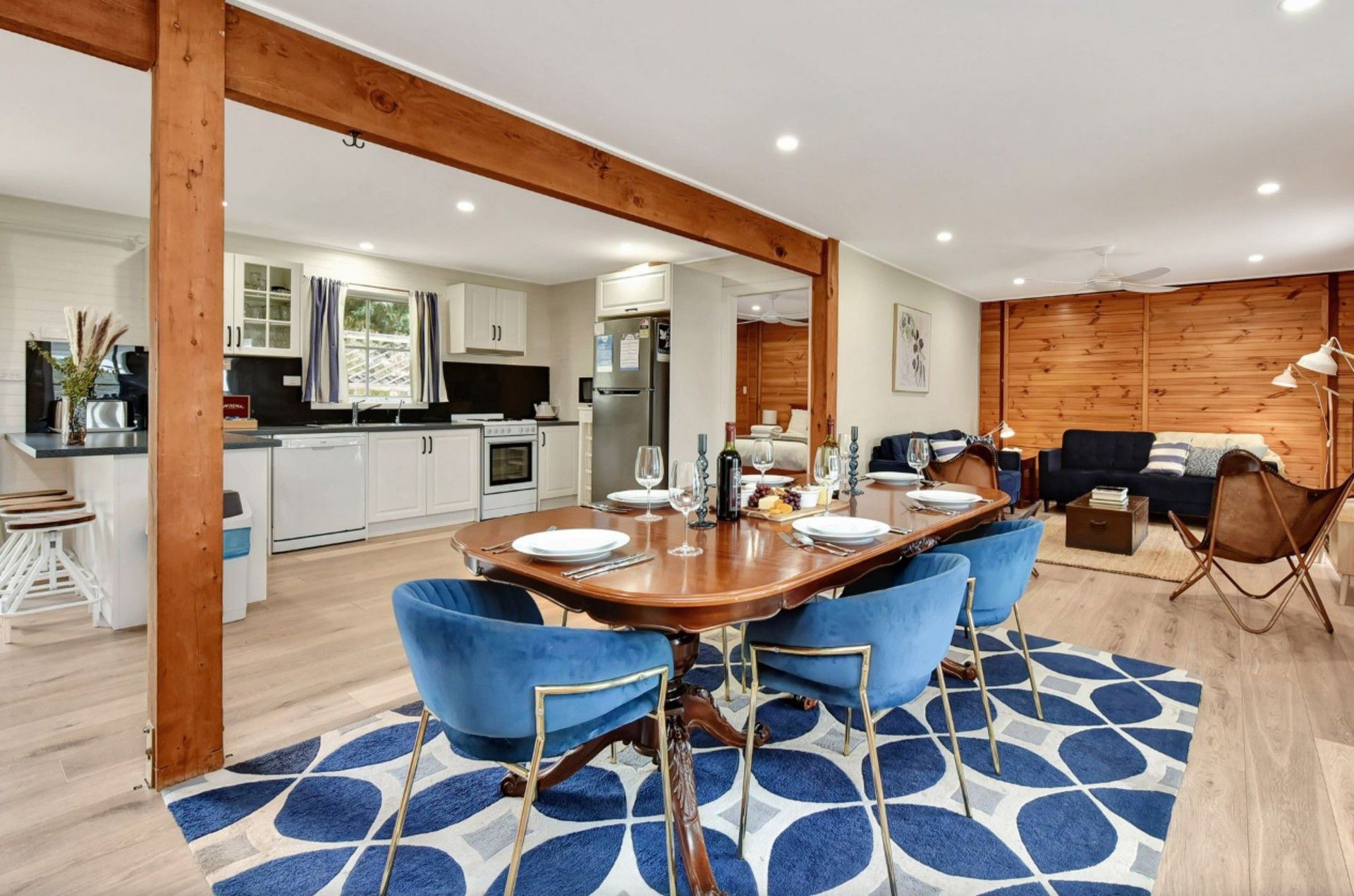 A fully fitted kitchen allows casual dining either at the full sized dining table or outside at the picnic table on the walkout verandah overlooking the estate. A great place for large groups who want the space to be together either inside or out.